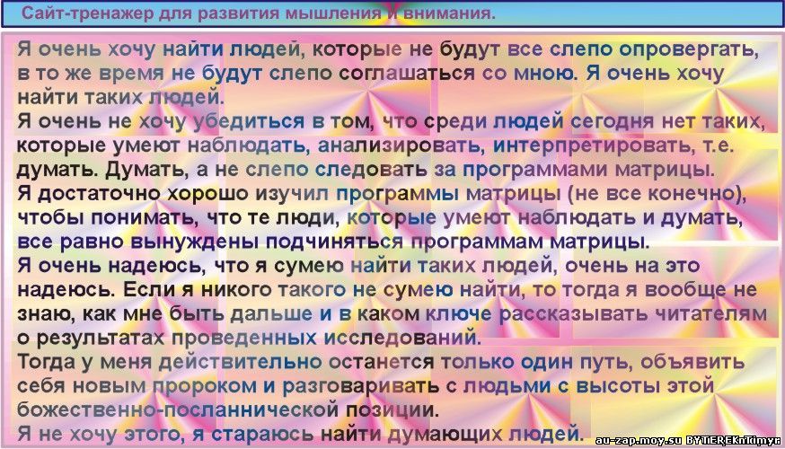 Эволюция живых существ протекает в зоне мыслительной деятельности, в зоне формирования микровселенных, а не в зоне формирования грубых физических тел. Если Вы, дорогой читатель, не можете понять то, о чем я рассказываю на данном сайте, вам нужно читать то, что я написал ранее в своих книгах и на своих предыдущих сайтах. Но при этом вы должны понимать, что познание методом чтения является самой примитивной формой познания. Вам нужно (кроме чтения, которое важно и необходимо) учиться действовать, учиться совершать поступки, учиться тренировать свою мыслительную систему. Весь необходимый набор упражнений для практических тренировок я описал и выложил в свободном бесплатном доступе. Весь комплекс практических советов мною записан в книгах, на сайтах, читайте, учитесь, тренируйтесь, совершайте реальные целенаправленные поступки в жизни.